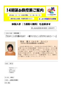 2026年1月6日 / 最終更新日時 : 2026年1月6日 necchu-kotoura 授業のご案内 次回14期第4回授業のご案内 Tweet Pocket 安部純子先生と中島信也先生をお迎えします。安部先生は、パワーあふれる市職員。世界修行の成果をまちづくりに全力投球中です。中島先生は、だれでもご存じのテレビCMを連発した人。お二人から学ぶことは多いと思いますよ。楽しみにしてください。 \ 最新情報をチェック / FacebookXBlueskyHatenaCopy コメントを残す コメントをキャンセルメールアドレスが公開されることはありません。 ※ が付いている欄は必須項目ですコメント ※ 名前 ※ メール ※ サイト 上に表示された文字を入力してください。 Δ