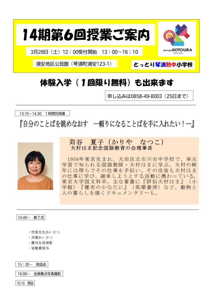 2026年3月12日 / 最終更新日時 : 2026年3月13日 necchu-kotoura 授業のご案内 次回(14期第6回)授業のご案内 Tweet Pocket 苅谷夏子先生の授業タイトルが決まりました。「自分のことばを眺めなおすー頼りになることばを手に入れたい!ー」楽しみですね。 \ 最新情報をチェック / FacebookXBlueskyHatenaCopy コメントを残す コメントをキャンセルメールアドレスが公開されることはありません。 ※ が付いている欄は必須項目ですコメント ※ 名前 ※ メール ※ サイト 上に表示された文字を入力してください。 Δ